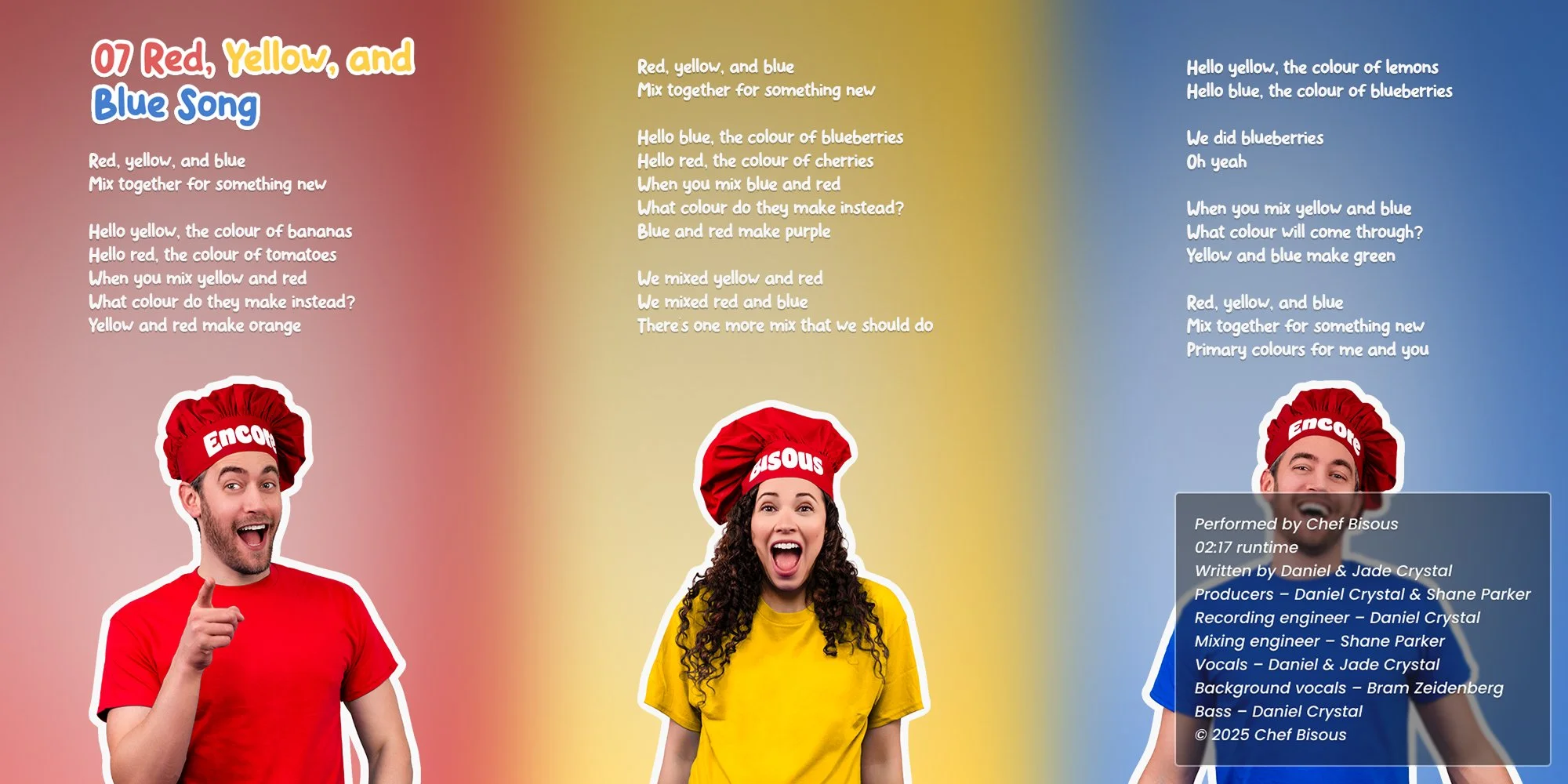 Founded in February 2024, Toronto-based Chef Bisous is a bilingual children’s educational act on YouTube, created by Order of Vaughan recipient and certified teacher Jade Crystal and her musician husband, Daniel. Together, they independently write, produce, design, and market their content. Chef Bisous offers full-length lesson videos and sing-along songs covering concepts like shapes, opposites, planets, and more, amassing over 750K views on YouTube. Each video is paired with a fun recipe and free, activity sheets available at chefbisous.com in both english and french, encouraging hands-on learning that extends beyond the screen. Their debut album, Tasty Tunes Vol. 1, features the viral hit “Boat Song,” co-written by their 4-year-old son. Their follow-up, A Bite-Sized Snack, continues the fun with songs like Which Bin Song, Trick or Treat Halloween Song, and Gingerbread Man Song. With Juno-nominated collaborations, live shows, and all merchandise proceeds supporting Canadian Feed the Children, Chef Bisous is on a mission to inspire curiosity, creativity, and a love for learning in children everywhere.